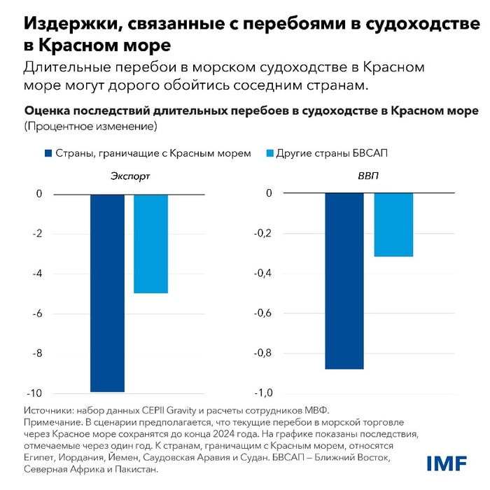 Постоянные перебои морских перевозок, направляемых через Красное море, могут обернуться значительными экономическими последствиями для наиболее уязвимых стран. Как показывает наглядный сценарий, приведенный в нашем последнем докладе «Перспективы развития региональной экономики», страны, граничащие с Красным морем (Египет, Иордания, Саудовская Аравия, Судан и Йемен), могут потерять примерно 10 процентов своего экспорта и почти 1 процент валового внутреннего продукта, если перебои будут продолжаться до конца этого года.