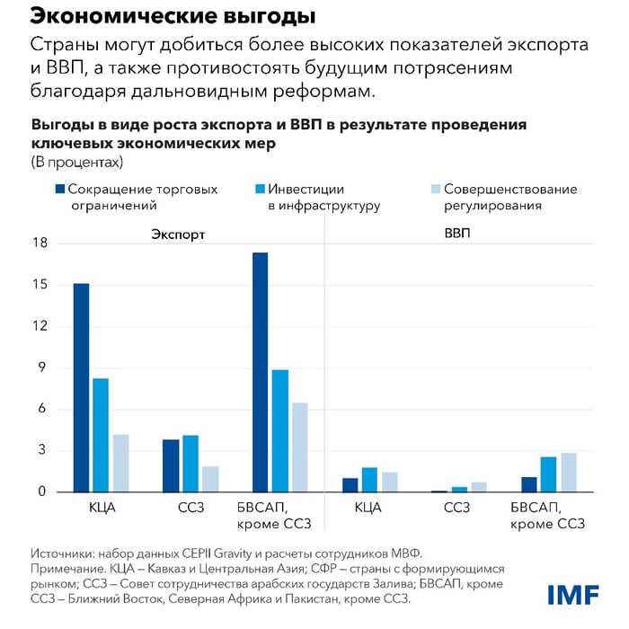В этом могут помочь адресные экономические реформы, однако решающее значение имеют подготовительные меры. Как показывает наше исследование, снижение нетарифных торговых барьеров, наращивание инвестиций в инфраструктуру и улучшение качества регулирования могут помочь увеличить торговлю в среднем на 17 процентов в среднесрочной перспективе, тогда как производительность экономики может повыситься на 3 процента. Это также позволит повысить устойчивость к будущим торговым потрясениям.