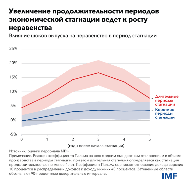 Согласно новому анализу МВФ, периоды стагнации продолжительностью от четырех лет и более, как правило, увеличивают неравенство доходов внутри стран почти на 20 процентов, что значительно выше, чем увеличение вследствие прямой рецессии.