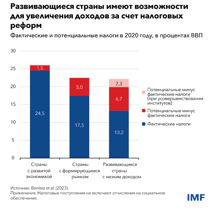 У развивающихся стран есть большие возможности для увеличения доходов посредством налоговых реформ — до 9 процентов ВВП, согласно нашему исследованию. Тем не менее крайне важно придерживаться прогрессивного подхода, который означает обеспечение того, чтобы те, кто может позволить себеплатить больше налогов, вносили свою справедливую долю. Например, налогообложение доходов от капитала и собственности предлагает относительно прогрессивный способ увеличения налоговых поступлений.
