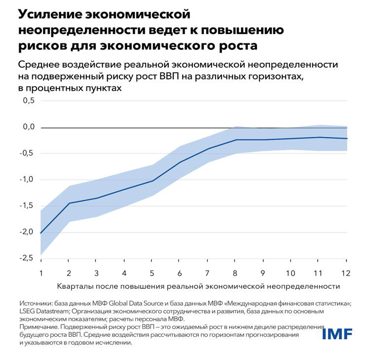 Если показатели экономической неопределенности повысятся так, как это было во время мирового финансового кризиса, то величина, которую мы считаем нижним децилем в распределении потенциальных показателей экономического роста, также известная как «хвостовой риск» значительного ухудшения ситуации, снизилась бы на 1,2 процентных пункта. Это означает, что если раньше при неблагоприятном сценарии прогнозировался рост мировой экономики на 0,5 процента, то теперь бы предполагалось, что она сократится на 0,7 процента.