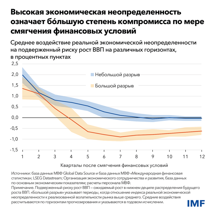 В более общем плане высокая экономическая неопределенность может обострить то, что мы называем компромиссом между макроэкономической и финансовой стабильностью, который обусловлен мягкими условиями на финансовых рынках. Когда финансовые условия смягчаются, ожидания экономического роста обычно повышаются, а риски ухудшения экономической ситуации в первый год снижаются. Это происходит в силу таких факторов, как снижение процентных ставок, повышение стоимости активов, сужение кредитных спредов и ослабление волатильности фондового рынка. Однако смягчение финансовых условий может повысить долговую уязвимость, а это усилит риски снижения экономического роста в будущем.