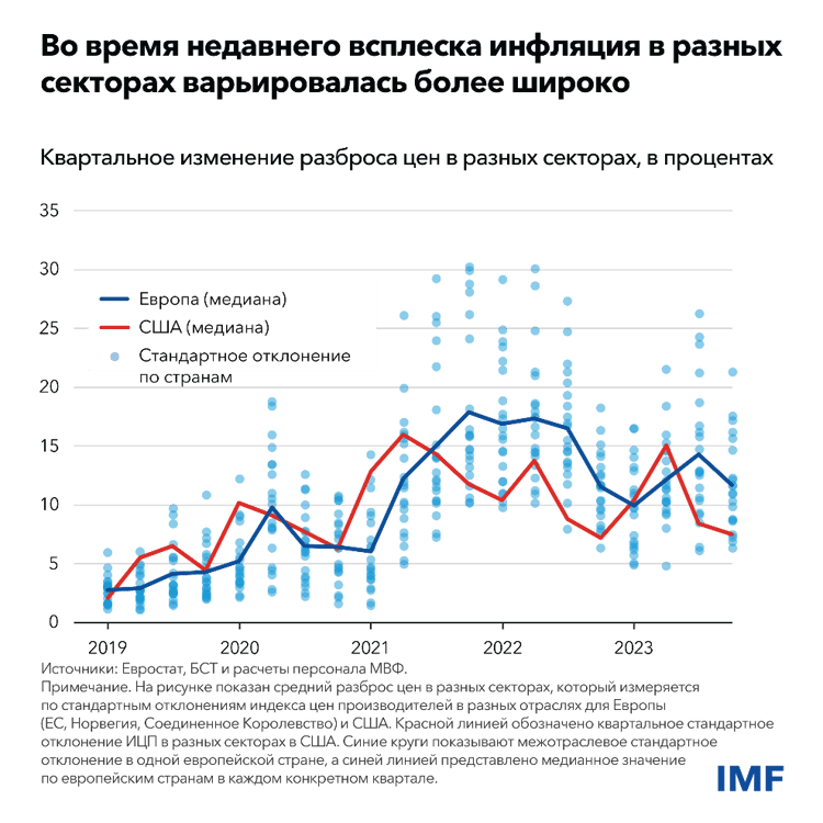 Для того чтобы понять недавний всплеск глобальной инфляции, нам необходимо рассматривать не только традиционные макроэкономические агрегаты. Наша модель показывает, как всплески инфляции в определенных секторах стали неотъемлемой частью базовой инфляции, менее волатильного показателя, вкотором не учитываются цены на продовольствие и энергоносители. Ключевым моментом в нашем анализе является взаимосвязь между ростом спроса и узкими местами и шоками, характерными для отдельных секторов. Они вызвали значительные изменения относительных цен, которые привели к необычному разбросу цен.