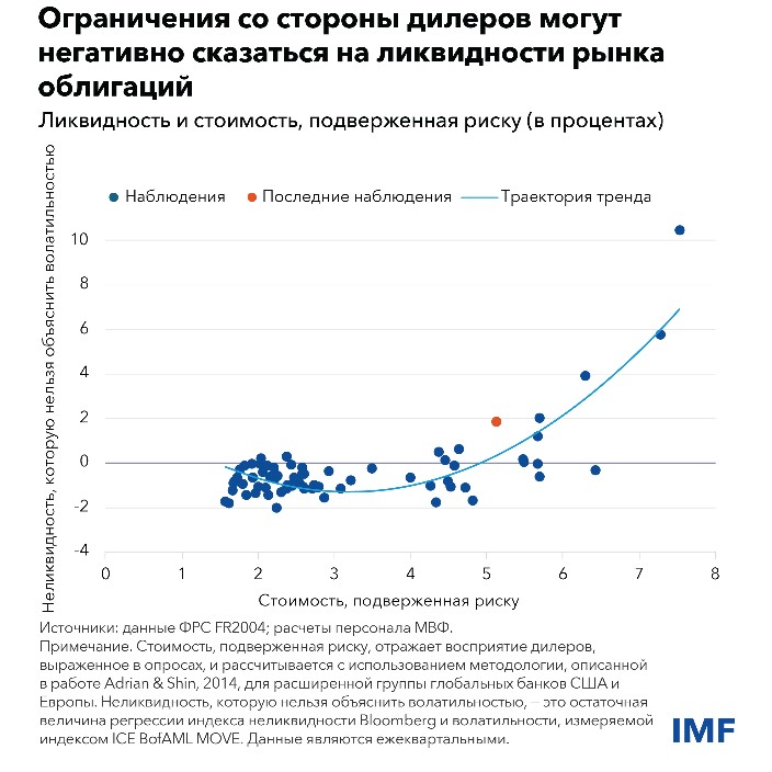 Динамика посреднической деятельности дилеров может существенно влиять на ликвидность. На волатильных рынках дилеры сталкиваются с ростом стоимости, подверженной риску, и с другими показателями рисков, что затрудняет их посредническую деятельность. Вусловиях повышенной волатильности банки-дилеры могут отказаться от проведения операций, усугубляя состояние ликвидности. В целом восприятие повышенного риска со стороны дилеров может снизить активность маркет-мейкеров и усугубить неликвидность на рынке, о чем свидетельствует наш недавний документ, подготовленный в соавторстве с сотрудниками Федерального резервного банка Нью-Йорка.