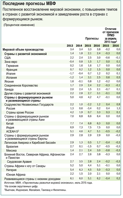 По словам Бланшара, изменения в целом разворачиваются в очень близком соответствии с прогнозами, составленными в апреле. «То есть происходит улучшение восстановления в странах с развитой экономикой и замедление базовых темпов роста в странах с формирующимся рынком». Мировой рост прогнозируется на уровне 3,3 процента в текущем году, как и в 2014 году, и 3,8 процента в следующем году (см. таблицу).