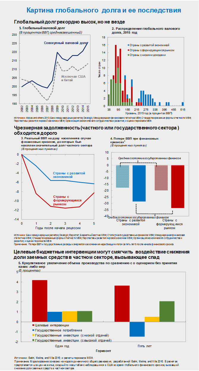 Сокращение доли заемных средств до сих пор шло медленными темпами в странах с развитой экономикой, имеющих высокий уровень задолженности, в основном из-за сложившейся обстановки, в которой темпы роста и инфляции остаются низкими. Сокращение доли заемных средств может ухудшить положение, в еще большей степени затормозив экономическую активность. Высокие уровни долга могут замедлить восстановление экономики по ряду причин.
