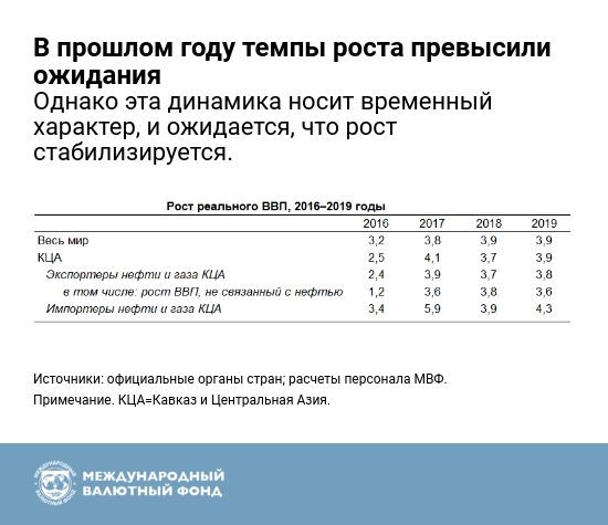 Согласно последнему прогнозу МВФ по региону Кавказа и Центральной Азии (КЦА), темпы роста превзошли ожидания в 2017 году, но в перспективе будут снижаться.
