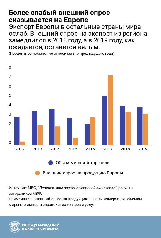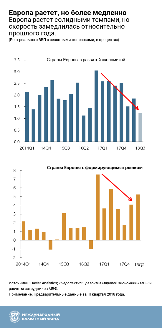 Экономика Европы продолжала расти в первой половине 2018 года, хотя и медленнее, чем ожидалось, особенно в странах с развитой экономикой Европы. Экономическая активность продолжала усиливаться в первой половине 2018 года, определяемая внутренним спросом, как отмечает МВФ в своей последней оценке состояния экономики Европы. Но перспективы являются менее благоприятными, при этом экономическому росту, скорее всего, будут препятствовать несколько сил.