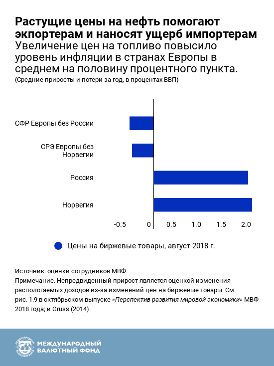 3. Более высокие цены на нефть отрицательно сказываются на доходах. За последний год цены на энергоресурсы, в том числе на нефть, выросли. Цены на биржевые товары с весны 2018 года увеличились на 7 процентов, тогда как в сентябре 2018 года цены на нефть выросли примерно до 80 долларов за баррель. В результате, в большинстве стран Европы реальные располагаемые доходы упали в среднем на 0,5 процентного пункта ВВП. Однако производители нефти, Норвегия и Россия, выигрывают от такой динамики.