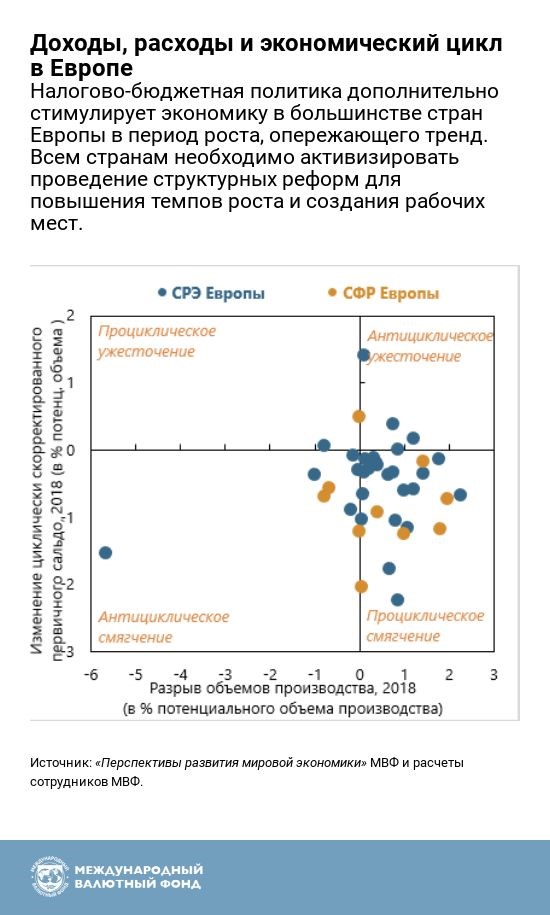6. Налоги и расходы. Официальные органы в регионе в основном предпочитают меры налогово-бюджетной политики, которые дополнительно стимулируют экономику в текущий период подъема, опережающего тренд. Соответственно, дефициты остаются относительно крупными несмотря на годы активного роста. Директивным органам следует воспользоваться этой возможностью, открываемой продолжающимся ростом и низкой безработицей, для принятия благоприятных для роста мер политики, чтобы снизить высокий уровень государственной задолженности и восстановить ресурсы для будущих непредвиденных ситуаций, — предлагает МВФ.