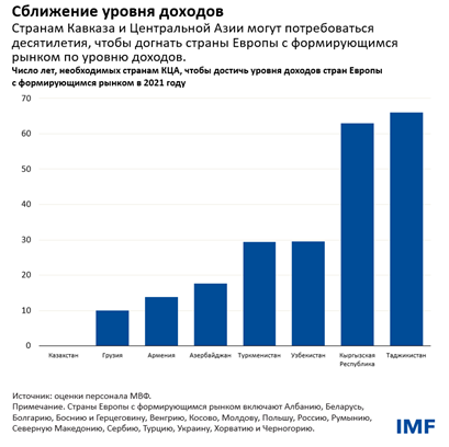 После обретения независимости в начале 1990-х годов уровень доходов и жизни на Кавказе ивЦентральной Азии (КЦА) улучшился, но по-прежнему значительно ниже уровня стран Европы сформирующимся рынком. Государство продолжает играть доминирующую роль во многих странах КЦА, и переход к рыночной экономике еще не завершен. В настоящее время регион сталкивается с рисками глобальной фрагментации в связи с войной России в Украине, которая может нарушить торговые и финансовые потоки. Без повышения темпов и инклюзивности роста региону могут потребоваться десятилетия, чтобы догнать страны Европы с формирующимся рынком по уровню доходов — более шести десятилетий для Таджикистана и Кыргызской Республики и почти три десятилетия для Узбекистана и Туркменистана.