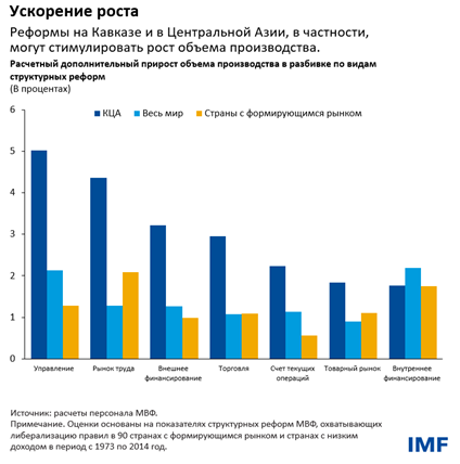 Наши исследования показывают, что структурные реформы могут способствовать увеличению объема производства в КЦА на 5–7 процентов в ближайшие 4–6 лет и значительно повысить благосостояние людей. Реформы управления, включая реформы государственных предприятий, принесут наибольший прирост объема производства в регионе — почти 6 процентов. За ними следуют реформы рынка труда, ослабление ограничений на внешнее финансирование и торговлю и либерализация товарных и финансовых рынков. Кроме того, страны с более эффективным управлением, как правило, получают большие дивиденды в виде экономического роста от других реформ. Это говорит о том, что реформы управления, затрагивающие все секторы экономики, могут усилить положительное влияние других реформ и должны проводиться в первую очередь.