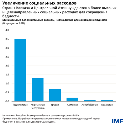 Наконец, увеличение целенаправленных социальных расходов может сократить масштабы нищеты и повысить уровень жизни бедных слоев населения. Например, Таджикистану необходимо ежегодно тратить дополнительно 3,5 процента ВВП на системы социальной защиты, чтобы поднять средний доход бедных граждан до международной черты бедности в 3,65 доллара США вдень. Хорошо продуманные системы социальной защиты помогут защитить наиболее уязвимые слои населения от воздействия реформ, необходимых для снижения роли государства вэкономике и принятия новой модели роста.