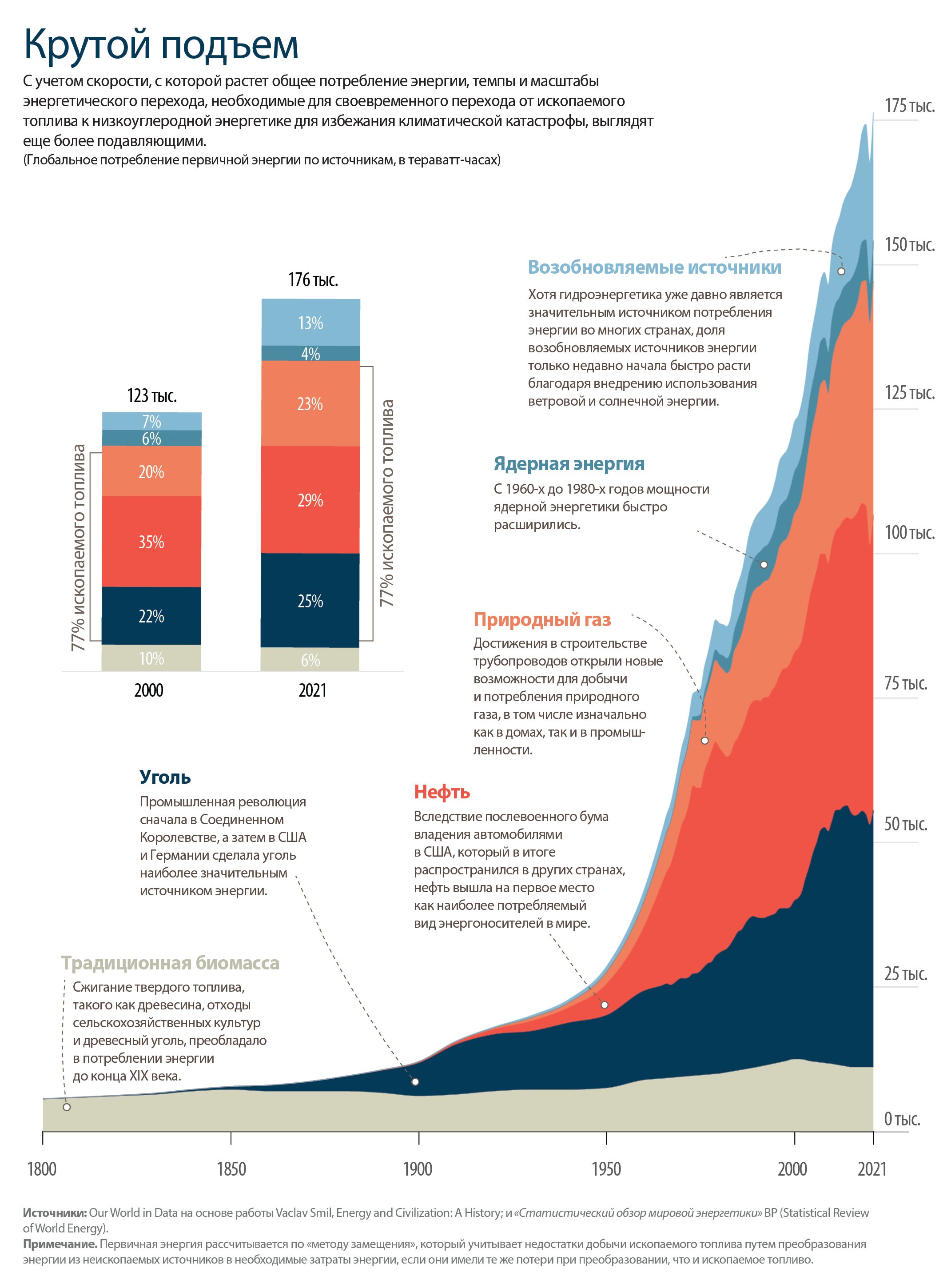 Энергетический переход, который нужен сегодня, не похож ни на один другой в истории (см. статью «Нелегкий путь к чистой энергетике» в этом выпуске ФиР). Энергетические переходы прошлого на самом деле были просто энергетическими дополнениями, потому что в мире потреблялось все больше различных видов энергии.
