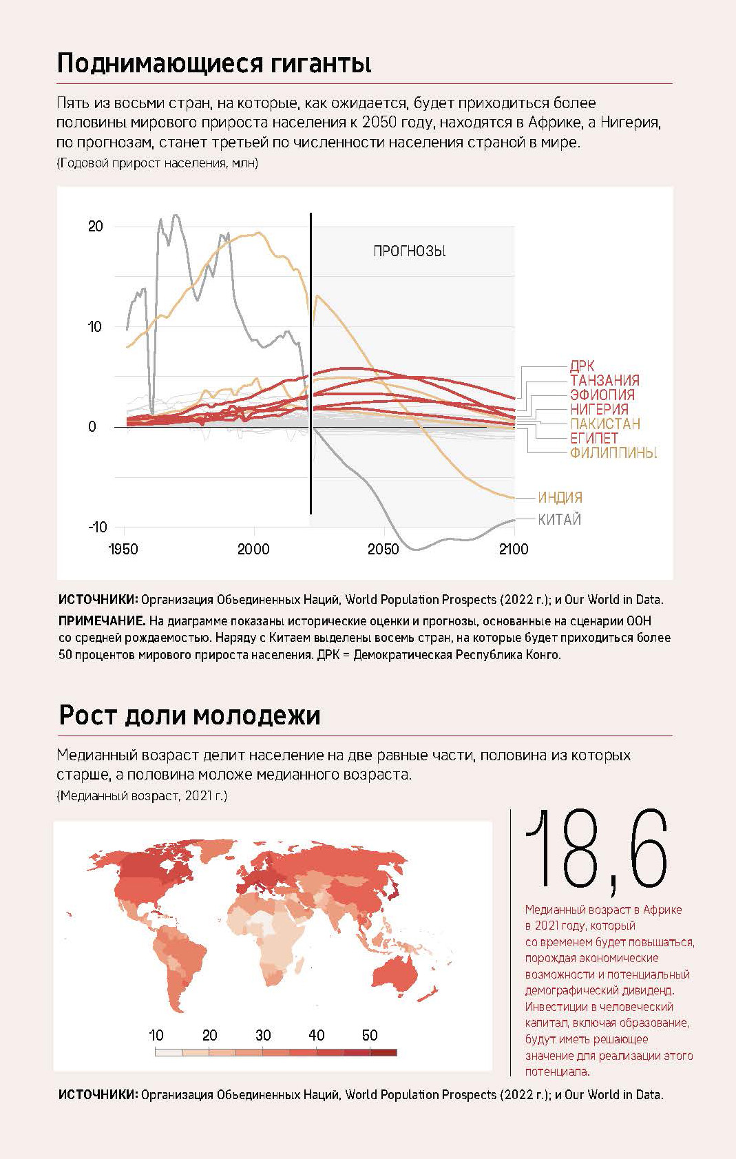 ООН ожидает, что более половины прироста мирового населения в течение следующих трех десятилетий придется на всего лишь восемь стран, пять из которых находятся в Африке. Население трудоспособного возраста в этих африканских странах, как и во многих других странах континента, будет расти быстрее любой другой возрастной группы.