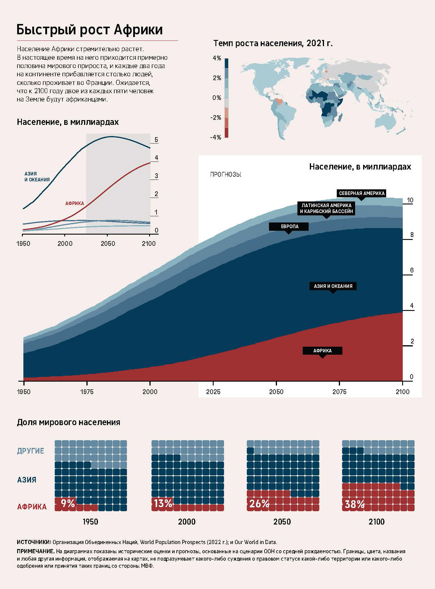 По прогнозам Организации Объединенных Наций, к 2050 году население Африки достигнет почти 2,5 млрд. Эта цифра будет означать, что более 25 процентов населения мира будут африканцами. После этого рост населения Африки замедлится, но континент останется крупнейшим источником роста в мире: ожидается, что к концу столетия его доля в мировом населении достигнет примерно 40 процентов.