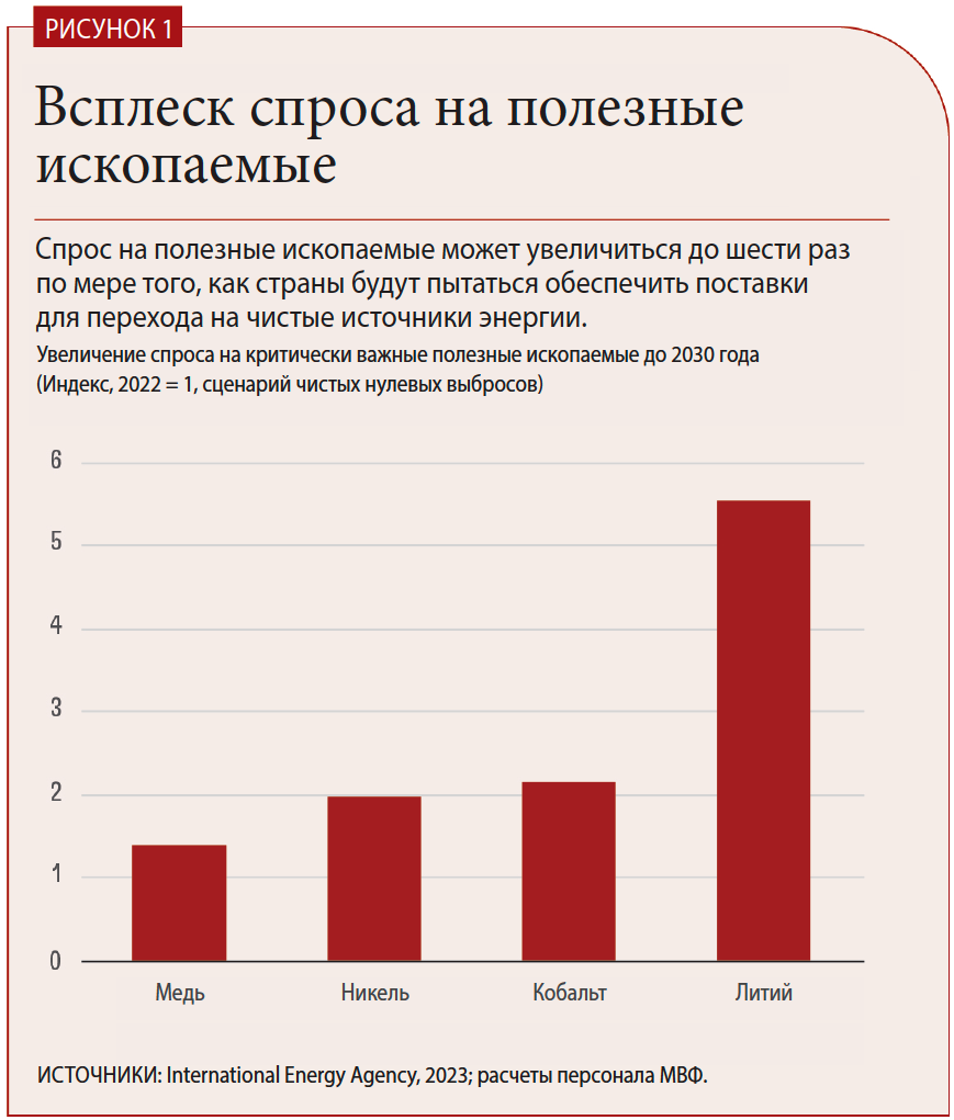 Даже в отсутствие дополнительных сложностей, связанных с геополитически мотивированным контролем над экспортом, странам потребуются беспрецедентные запасы критически важных минералов, чтобы предотвратить наихудшие последствия изменения климата и достичь нулевого чистого уровня выбросов. Согласно прогнозу Международного энергетического агентства, к 2030 году спрос на медь должен возрасти в 1,5 раза, на никель и кобальт — в два раза, а на литий — в шесть раз (рис. 1). Это приведет к росту цен, и в течение следующих двух десятилетий эти полезные ископаемые могут стать столь же важны для мировой экономики, как нефть (Boer, Pescatori, and Stuermer (готовится к публикации).
