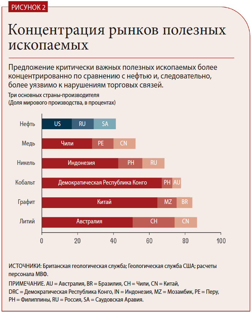 Критически важные полезные ископаемые чрезвычайно уязвимы в случае нарушений торговли, поскольку их мировое производство отличается высокой концентрацией. Две трети мирового кобальта добывается в одной только Демократической Республике Конго. Три основных страны — производителя никеля и лития контролируют более 60 процентов поставок этих ресурсов. По сравнению с ними добыча нефти значительно более диверсифицирована (рис. 2).
