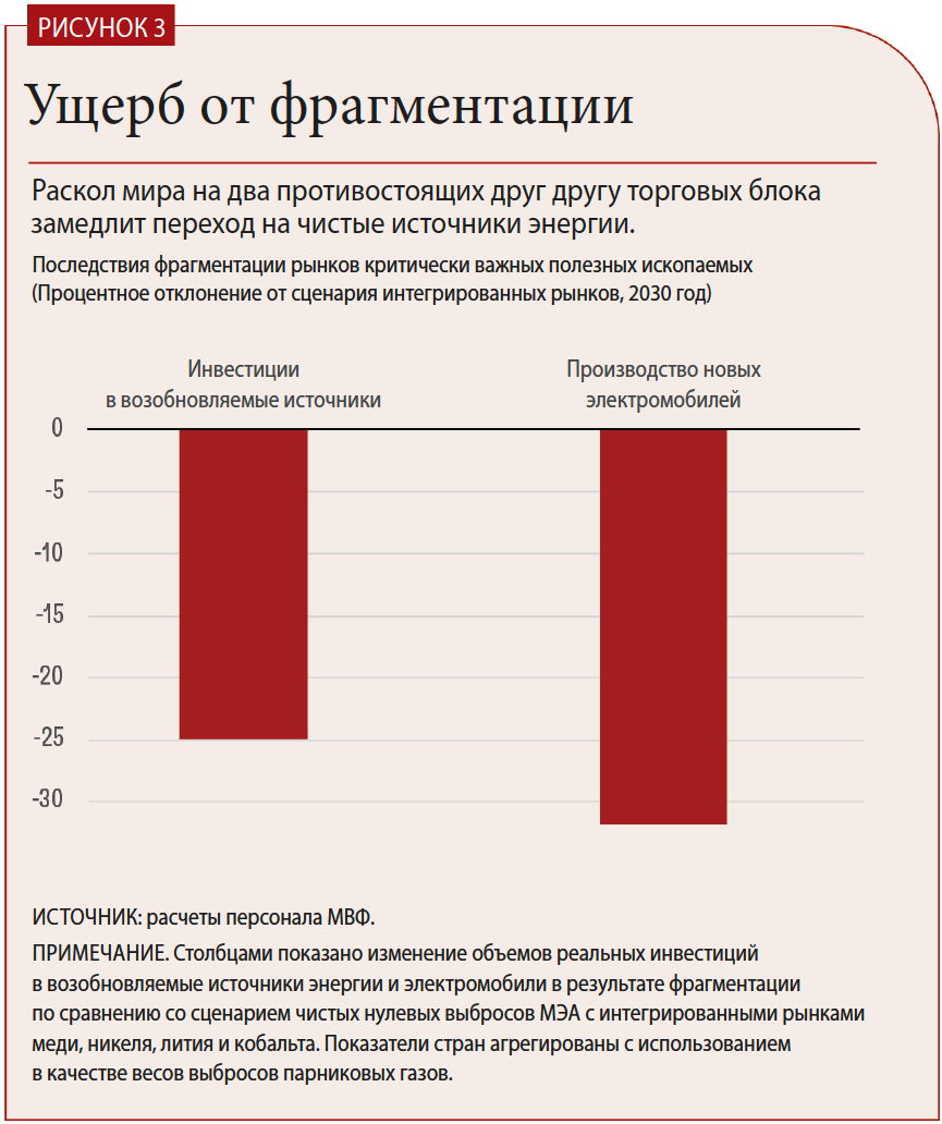 В случае фрагментации рынков полезных ископаемых будет труднее достичь декарбонизации мировой экономики. В целом мировые чистые инвестиции в технологии на основе возобновляемых источников энергии и производство электромобилей будут примерно на 30 процентов ниже, если агрегировать показатели по регионам с использованием в качестве весов выбросов парниковых газов (рис. 3). Этот анализ учитывает более высокую интенсивность выбросов парниковых газов, связанных с активностью в блоке Китай — Россия+, и, следовательно, необходимость более значительных усилий для достижения целей по сокращению мировых выбросов.