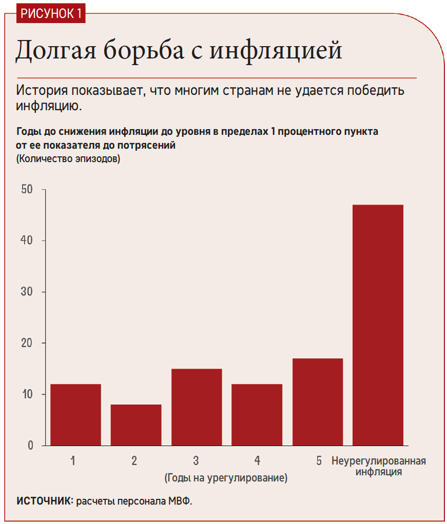 Наше недавнее исследование более 100 инфляционных шоков с 1970-х годов выявило два повода сохранять бдительность. Во-первых, история учит нас, что инфляция носит устойчивый характер. На то, чтобы ослабить инфляцию, снизив ее до уровня, который преобладал до первоначального шока, уходят годы. Сорок процентов стран в нашем исследовании не смогли справиться с инфляционными шоками даже через пять лет. Оставшимся 60 процентам понадобилось в среднем три года, чтобы вернуть инфляцию к показателям до возникновения шока (рис. 1).