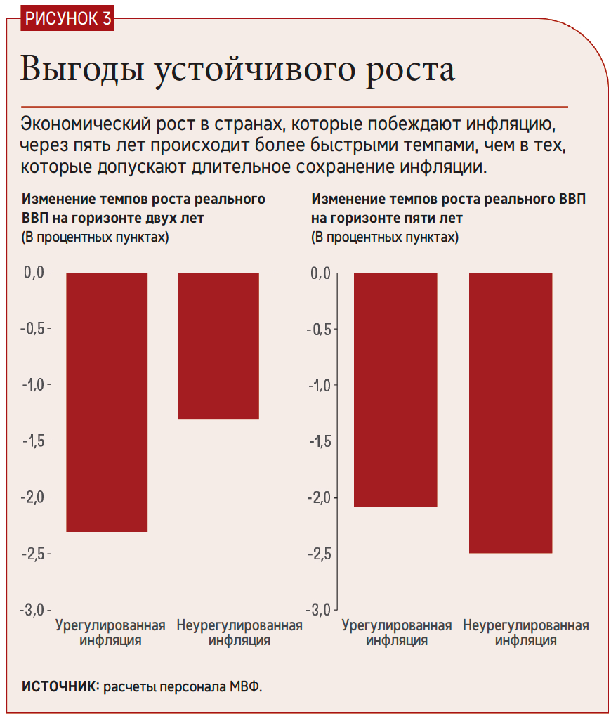 Бороться с инфляцией сложно. Однако важно признать преимущества стабильности цен. В прошлом страны, которые справились с инфляцией, в краткосрочной перспективе имели более низкие темпы экономического роста, чем те, которые не смогли этого сделать. Однако в среднесрочной и долгосрочной перспективе эта зависимость менялась на противоположную. Через пять лет после инфляционного шока страны, которые справились с инфляцией, имели более высокие темпы роста и более низкую безработицу, чем страны, которые допустили более длительное сохранение инфляции.