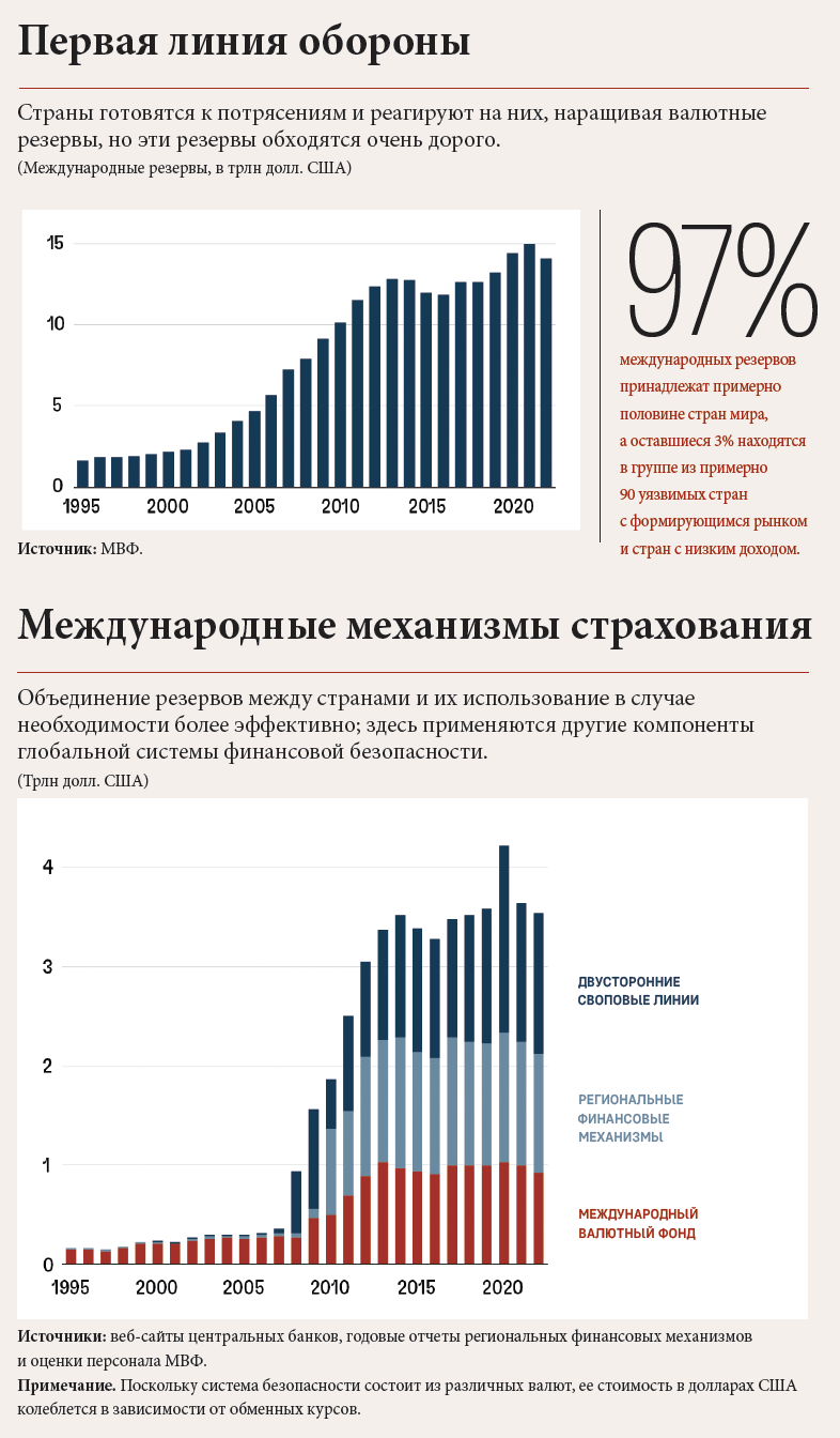 Международные резервы являются первой линией обороны в условиях кризиса, однако по причине их высокой стоимости они распределены неравномерно: основная их часть находится в странах с развитой экономикой и крупных странах с формирующимся рынком.