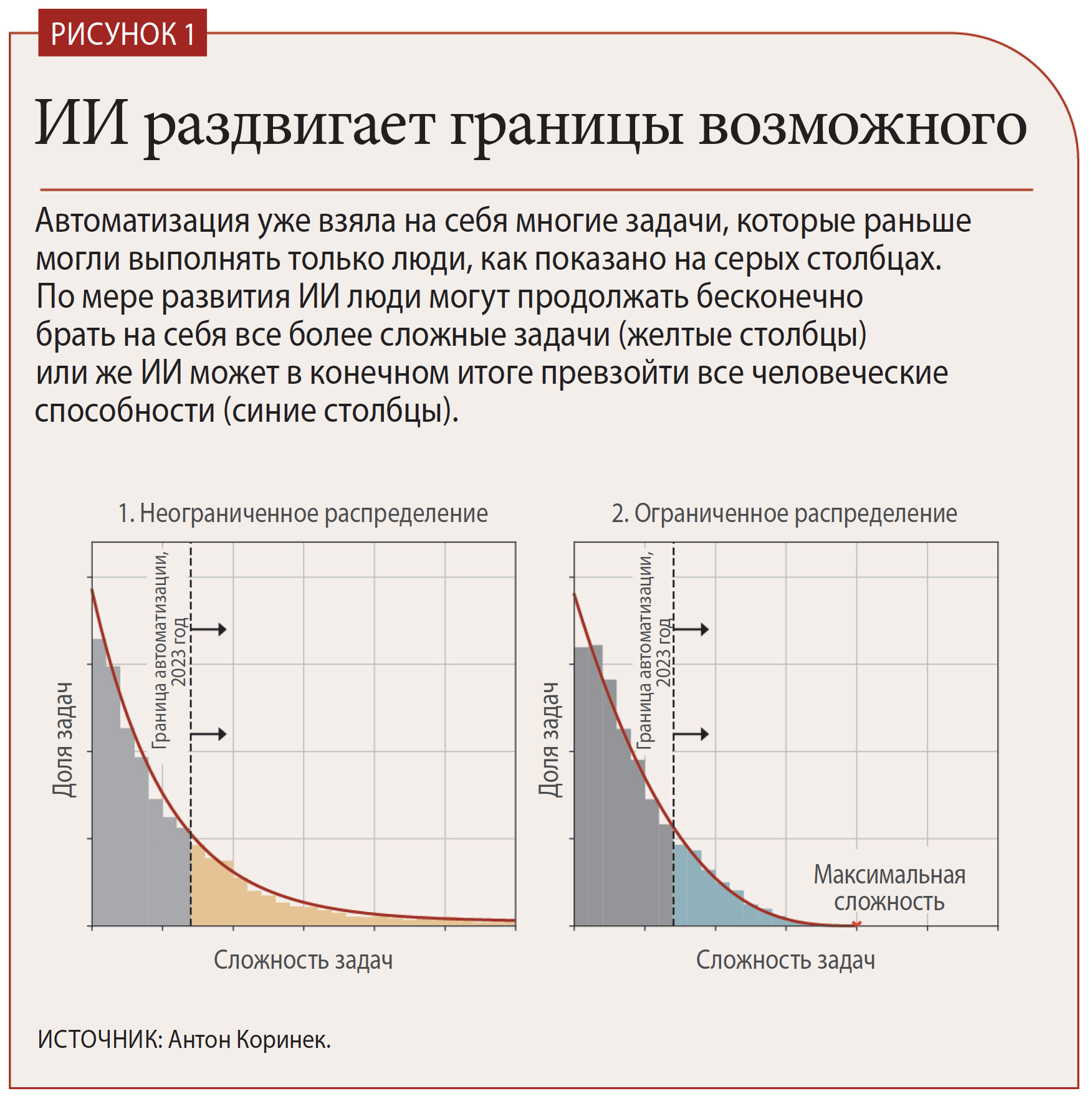 На панели 1 иллюстрируется одна точка зрения, что возможности человеческого мозга в решении все более сложных задач безграничны. Это согласуется с нашим экономическим опытом со времен промышленной революции: по мере расширения границ автоматизации, люди автоматизировали простые задачи (как механические, так и когнитивные) и перераспределяли работников для выполнения большего количества оставшихся более сложных задач, то есть они переместились в правую часть распределения сложности, проиллюстрированного на графике. Простая экстраполяция позволяет предположить, что этот процесс будет продолжаться по мере развития ИИ и автоматизации растущего числа когнитивных задач.
