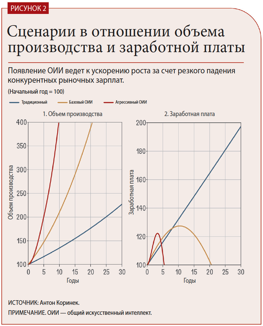 Во-вторых, заработная плата изначально будет расти во всех трех сценариях, но только до тех пор, пока имеется дефицит рабочей силы. Она резко падает, когда экономика приближается к появлению ОИИ.