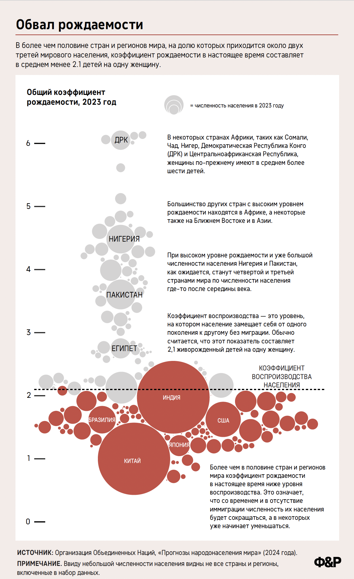 В большинстве стран мира происходят значительные демографические сдвиги. Более чем в половине стран мира, на долю которых приходится две трети мирового населения, коэффициенты рождаемости сейчас ниже необходимого для воспроизводства уровня, составляющего 2,1 ребенка на одну женщину. Если не принять меры, население этих стран со временем будет стареть и сокращаться.