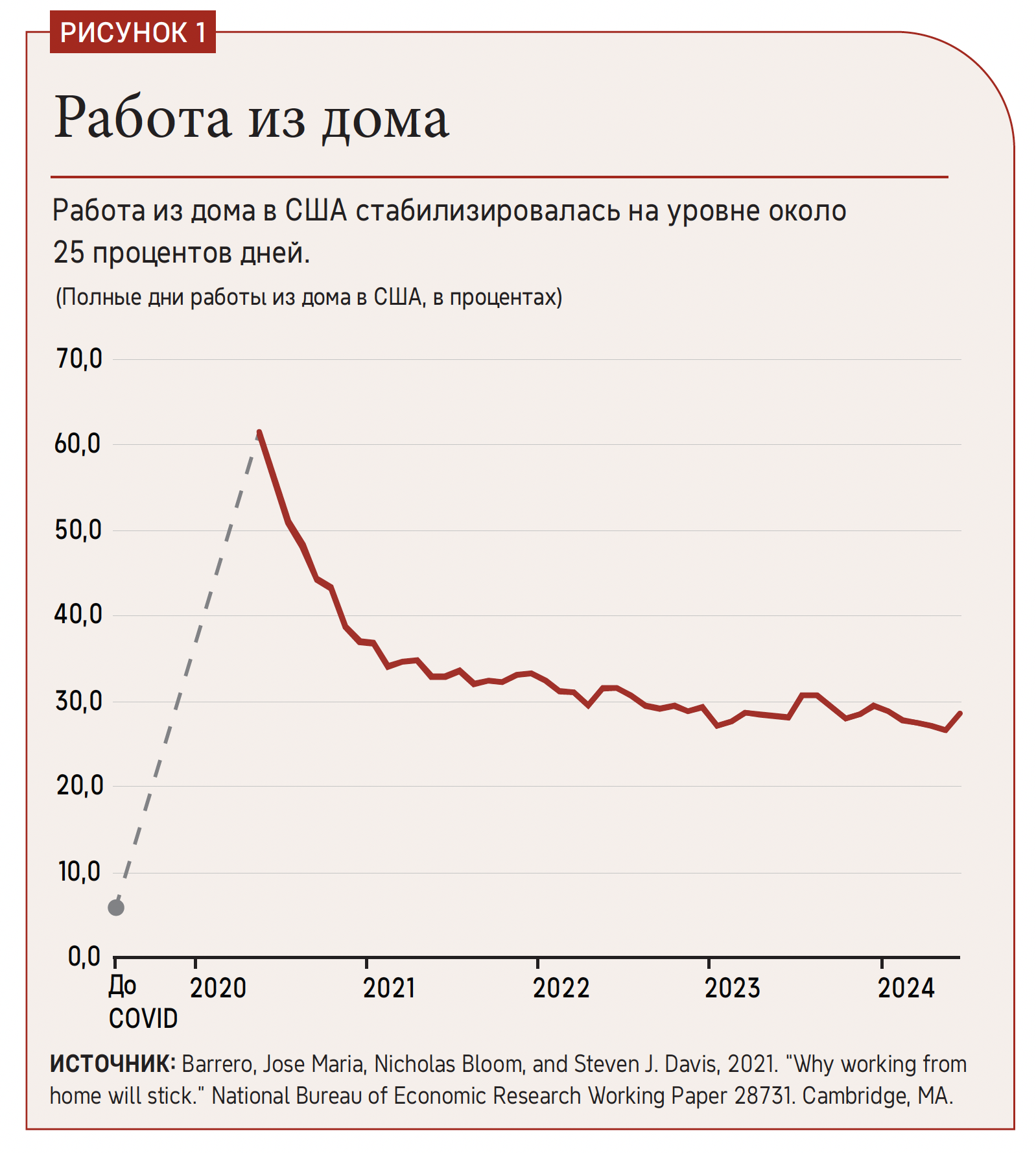 Классические микроэкономические исследования компаний и отдельных лиц обычно показывают, что гибридная модель работы, которая является обычной примерно для 30 процентов рабочей силы США, Европы и Азии, практически не влияет на производительность. Работа из дома приносит работникам пользу, избавляя их от утомительных поездок на работу и, как правило, обеспечивает более спокойную рабочую среду. Но вследствие сокращения времени, проводимого в офисе, она также может снизить способность сотрудников учиться, изобретать и общаться. Исследования показывают, что эти положительные и отрицательные эффекты примерно компенсируют друг друга, и гибридная модель работы из дома не оказывает никакого чистого влияния на производительность.
