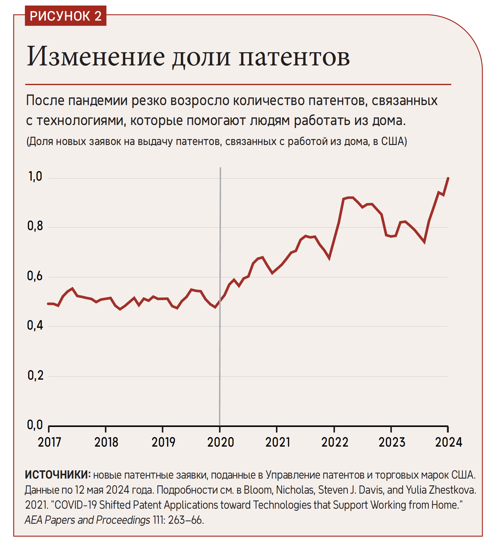 Этот цикл обратной связи уже начался. Доля новых патентных заявок в Управлении патентов и торговых марок США, в которых неоднократно используются термины «удаленная работа», «работа из дома» или аналогичные слова, не менялась до 2020 года, но потом начала расти (см. рисунок 2). Это наглядно демонстрирует процесс совершенствования технологий. Более совершенные камеры, мониторы, программное обеспечение и технологии, такие как дополненная и виртуальная реальность и голограммы, повысят производительность гибридной и удаленной работы в будущем. Это создаст положительную обратную связь между экономическим ростом и работой из дома.