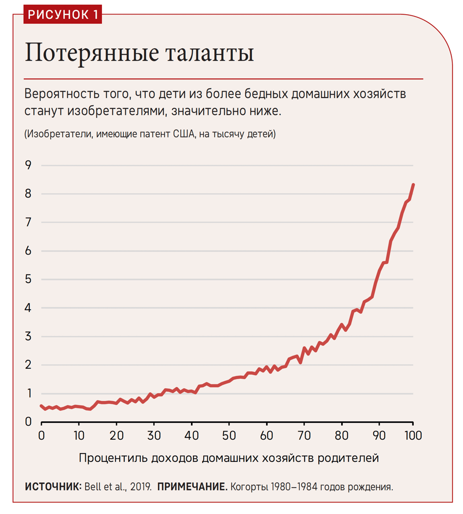 Вопреки насчитывающему 2400 лет изречению Платона, не только необходимость ― мать всех изобретений. Они также требуют наличия возможностей. Как показывают последние исследования, вероятность того, что человек станет новатором, отражает статус его родителей с точки зрения доходов и социологические факторы. Очень талантливые дети из неблагополучных слоев населения, как правило, разрабатывают инновации на уровне значительно ниже своего потенциала, а дети из более состоятельных или более образованных семей с гораздо большей вероятностью будут заниматься инновациями.