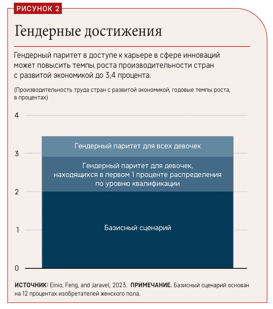 Макроэкономические издержки, связанные с невостребованными талантами, являются колоссальными. Как демонстрирует новая модель, которую разработали мы с Элиасом Эйнио и Джошом Феном (Elias Einio and Josh Feng, 2023), гендерный паритет в доступе к карьере в сфере инноваций может повысить темпы роста производительности на 70процентов. В случае стран с высокими доходами, таких как США, это приведет к увеличению годовых темпов роста производительности на 2,0–3,4 процента (рис. 2). Такой существенный прирост окажет глубокое воздействие как на благосостояние общества, так и на налоговые доходы. Эта модель исследователей также показывает, что большая часть экономических достижений объясняется вовлечением самых способных детей в профессии в сфере инноваций.