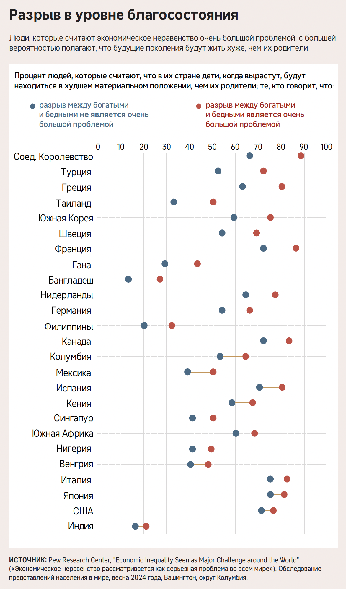 Эксперты Pew Research Center связывают пессимизм с восприятием экономического неравенства (см. график на этой странице). «В большинстве стран люди, которые считают разрыв между богатыми и бедными очень большой проблемой, особенно пессимистично смотрят на финансовое положение детей, когда те вырастут», — отмечают исследователи. Например, в Соединенном Королевстве 88 процентов респондентов, заявивших, что разрыв между богатыми и бедными является очень большой проблемой, также полагают, что дети будут жить хуже. Среди тех, кто считает, что разрыв в уровне благосостояния не является очень большой проблемой, о том, что дети будут жить хуже, говорят только 66 процентов.