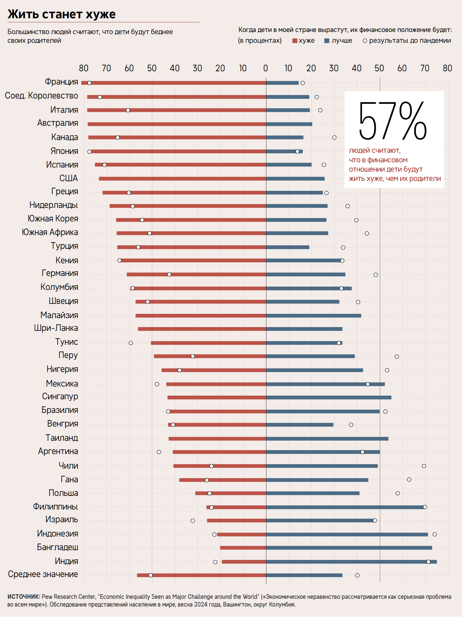 Большинство говорит, что дети будут жить хуже, чем их родители. В среднем эту точку зрения разделяют 57 процентов респондентов. Обеспокоенность особенно высока в странах с развитой экономикой, включая Канаду и США, а также многие европейские страны (см. график на странице справа). «Этот пессимистичный взгляд на экономическое будущее разделяют люди как более молодого, так и более старшего возраста, а также люди с более высокими и более низкими доходами», — отмечается в материалах Pew Research Center. Однако некоторые из развивающихся стран Азии с быстрорастущей экономикой, включая Бангладеш, Индию, Индонезию и Филиппины, настроены более оптимистично. Как минимум 70 процентов респондентов заявляют, что дети будут жить лучше.