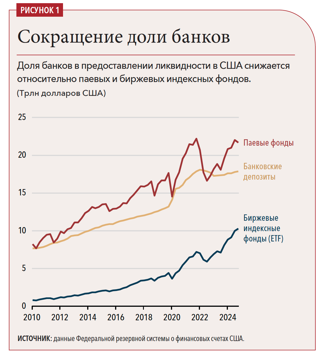 Когда-то банки были главными действующими лицами в деле создания ликвидности для финансовых рынков. Но сегодня не банки, а фонды управления активами, не являющиеся банками, предоставляют все больше ликвидности на повседневной основе домашним хозяйствам и инвесторам (рис. 1). Паевые инвестиционные фонды и биржевые индексные фонды (ETF) позволяют инвесторам выводить деньги по требованию, несмотря на то что эти фонды владеют активами, которые вовсе не являются ликвидными. Они обещают поддерживать ежедневную ликвидность, но имеющиеся у них базовые активы не всегда можно продать; в отличие от банков, они делают это без страхования вкладов, резервов капитала или доступа к деньгам центрального банка.