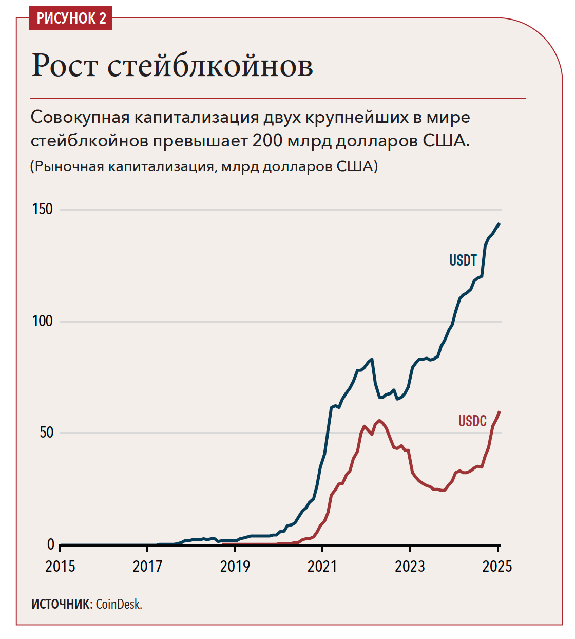 Чтобы исправить эту ситуацию, появились стейблкойны, близкие родственники биткойна (рис. 2). Как и биткойн, стейблкойны — это активы блокчейна, предназначенные для предоставления платежных услуг. Их росту могут поспособствовать новые законы США, включая законы GENIUS и STABLE. Важное отличие стейблкойнов от биткойна заключается в том, что они привязаны к реальным валютам, как правило, к доллару США. Чтобы сохранять эту привязку, такие эмитенты, как Circle (USDC) и Tether (USDT) держат резервы в банковских депозитах, казначейских ценных бумагах и корпоративных облигациях. Стейблкойны, в отличие от крайне волатильного биткойна, продемонстрировали свою перспективность в качестве дешевой и трансграничной альтернативы для платежей. Стейблкойны пришли на выручку жителям Аргентины, Турции и Венесуэлы, где высокий уровень инфляции; обычные люди в этих странах теперь используют стейблкойны для сбережений, отправки денежных переводов и расчетов по транзакциям. Они неуклонно вливаются в традиционные потоки платежей, и крупные банки и гиганты торговли задумались о выпуске собственных стейблкойнов.