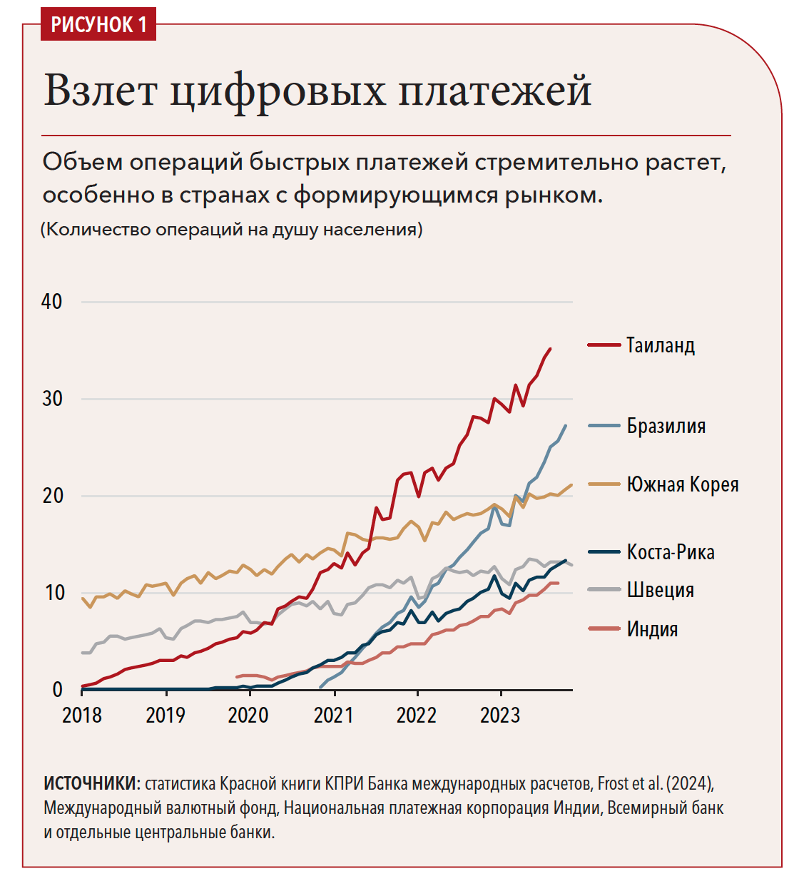 За последнее десятилетие коренным образом изменилось то, как мы осуществляем платежи, поскольку во многих странах, особенно в странах с формирующимся рынком, получили распространение так называемые системы быстрых или мгновенных платежей (см. рис. 1). Они позволяют осуществлять трансферты между конечными пользователями в режиме реального времени (или почти реального времени) (Frost et al., 2024). Быстрые платежи в режиме 24/7 обеспечивают финтех-компании, технологические гиганты и существующие банки. Они используют приложения для смартфонов и коды быстрого реагирования (QR-коды), работающие даже на низкотехнологичных телефонах. Как правило, они позволяют революционным компаниям предоставлять услуги, которые составляют прямую конкуренцию существующим компаниям.