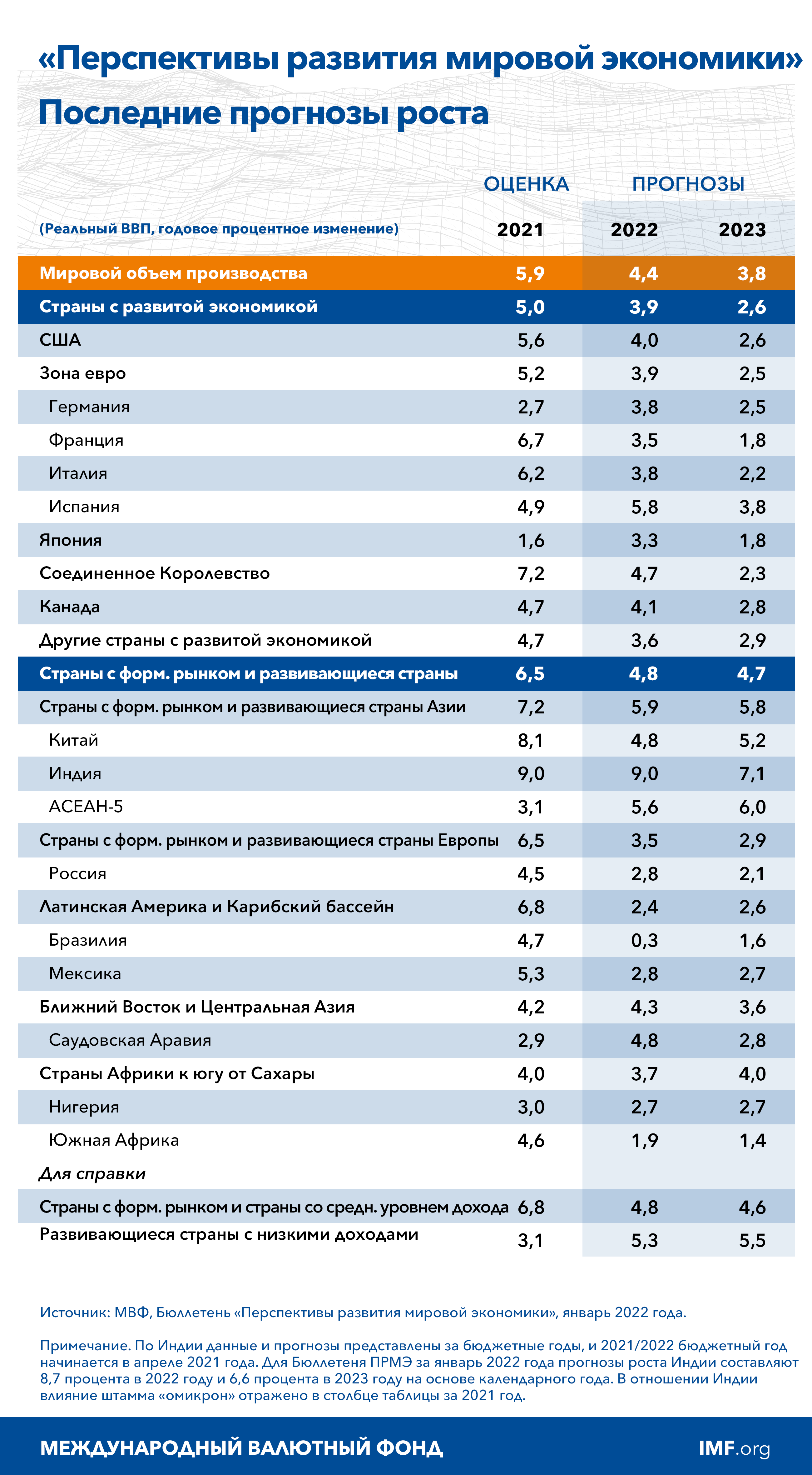 Ожидается снижение мирового роста с 5,9 процента в 2021 году до 4,4 процента в 2022 году — на пол процентного пункта ниже прогноза на 2022 год, представленного в октябрьском выпуске «Перспектив развития мировой экономики» (ПРМЭ), что в основном является следствием снижения прогнозов роста в двух крупнейших экономиках. Пересмотр предпосылок с изъятием из базового сценария пакета мер налогово-бюджетной политики «Восстановить и сделать лучше» (Build Back Better), более раннее прекращение адаптивных мер денежно-кредитной политики и сохранение дефицита поставок привели к пересмотру прогноза для США в сторону понижения на 1,2 процентного пункта. В Китае вызванные пандемией нарушения экономической активности, связанные с политикой нулевой терпимости в отношении COVID-19, а также длительное сохранение напряженного финансового положения среди застройщиков вызывали снижение прогноза на 0,8 процентного пункта. Ожидается, что в 2023 году экономический рост замедлится до 3,8 процента. Хотя это на 0,2 процентного пункта выше, чем в предыдущем прогнозе, указанное улучшение в основном является следствием механического повышения роста после того, как во второй половине 2022 года прекратится действие факторов, сдерживающих рост в настоящий момент. Условием данного прогноза является снижение численности неблагоприятных исходов для здоровья до низких уровней в большинстве стран к концу 2022 года, что предполагает увеличение доли вакцинированных во всем мире и повышение эффективности средств лечения.