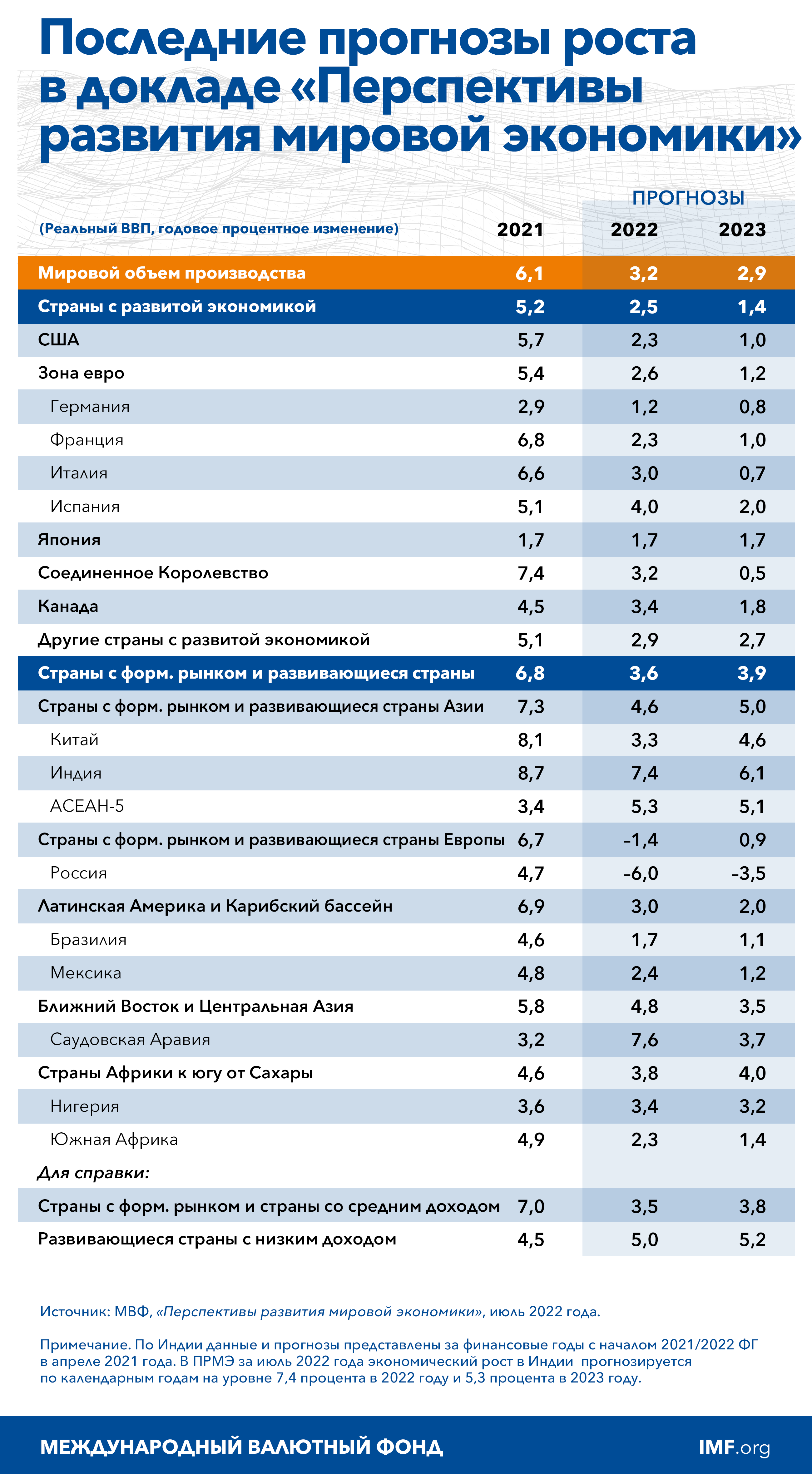 Базовый прогноз предусматривает замедление экономического роста с 6,1 процента в прошлом году до 3,2 процента в 2022 году, что на 0,4 процентного пункта ниже, чем прогнозировалось в апрельском выпуске «Перспектив развития мировой экономики» 2022 года. Более медленный рост ранее в этом году, снижение покупательной способности домашних хозяйств и ужесточение денежно-кредитной политики стали причинами пересмотра прогноза в сторону снижения на 1,4 процентного пункта для США. Новые периоды самоизоляции и углубление кризиса на рынке недвижимости в Китае вызвали снижение прогноза экономического роста на 1,1 процентного пункта, что сопровождается крупными глобальными вторичными эффектами. Для Европы значительное снижение прогнозов связано с последствиями войны в Украине и ужесточением денежно-кредитной политики. Прогноз глобальной инфляции был повышен за счет цен на продовольствие и энергоносители, а также сохраняющихся дисбалансов между спросом и предложением, и предполагается, что в этом году инфляция достигнет 6,6 процента в странах с развитой экономикой и 9,5 процента в странах с формирующимся рынком и развивающихся странах, что представляет собой повышение прогноза на 0,9 и 0,8 процентного пункта, соответственно. Дезинфляционная денежно-кредитная политика, как ожидается, окажет свое воздействие в 2023 году: глобальный объем производства, по прогнозам, вырастет лишь на 2,9 процента.