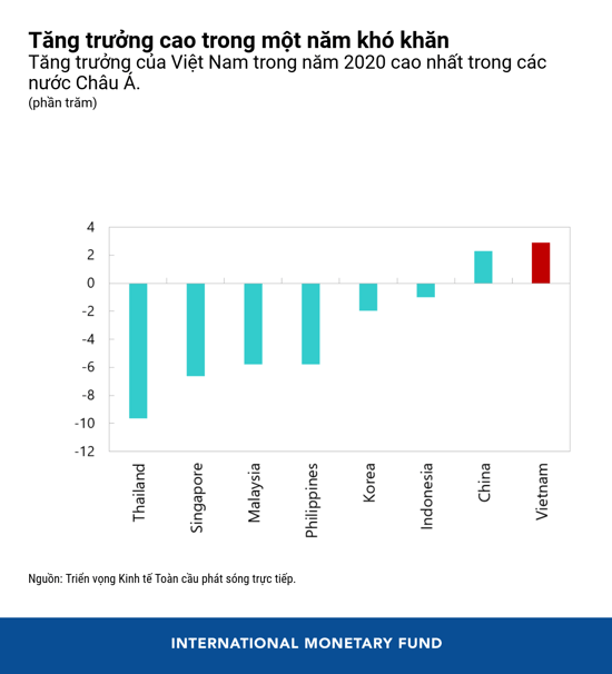 Bất chấp đại dịch COVID-19, nền kinh tế Việt Nam vẫn duy trì được khả năng chống chịu, tăng trưởng 2,9% trong năm 2020—một trong những mức tăng trưởng cao nhất thế giới—và được dự báo sẽ tăng trưởng 6,5% trong năm 2021, nhờ các yếu tố nền tảng kinh tế vững mạnh, các biện pháp kiểm soát dịch quyết liệt, và sự hỗ trợ đúng trọng tâm của chính phủ, theo đánh giá hàng năm gần đây nhất của IMF về tình hình kinh tế quốc gia.