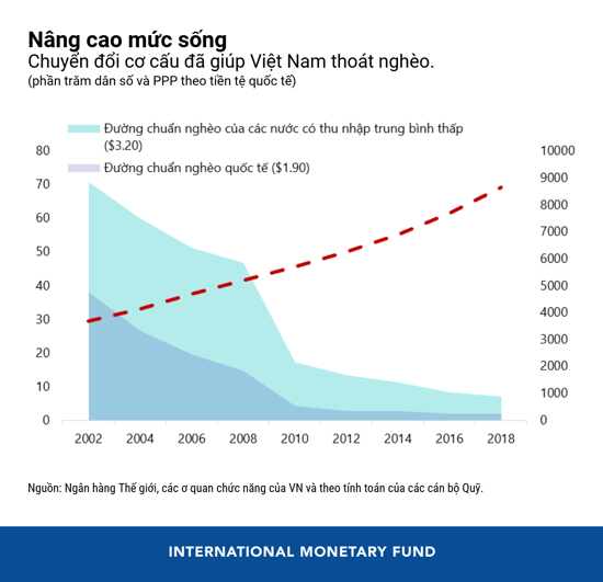 - Việt Nam bước vào đại dịch với những nền tảng kinh tế và đệm chính sách vững mạnh, mặc dù một số thách thức về mặt cơ cấu kinh tế vẫn cần được khắc phục. Kể từ khi bắt đầu công cuộc đổi mới kinh tế theo định hướng thị trường vào năm 1986, Việt Nam đã vươn lên từ một trong những quốc gia nghèo nhất thế giới trở thành một quốc gia thu nhập trung bình thấp. Sự chuyển đổi cơ cấu từ kinh tế nông nghiệp sang một nền kinh tế hiện đại dựa trên công nghiệp chế tạo, với vai trò dẫn dắt của khu vực có vốn đầu tư nước ngoài. và chủ trương “không để ai tụt lại phía sau” đã giúp nâng cao mức sống. Đầu tư nước ngoài mạnh và thặng dư cán cân vãng lai đã củng cố khả năng chống chịu trước các cú sốc bên ngoài. Sức khoẻ của hệ thống ngân hàng đã cải thiện với thanh khoản, lợi nhuận cao hơn và nợ xấu ít hơn so với trước đây, mặc dù các điểm yếu vẫn còn tồn tại. Việt Nam đã đạt được tiến bộ đáng kể về củng cố tài chính công trong giai đoạn trước COVID-19. Việc tích luỹ các đệm tài khoá, kinh tế đối ngoại, và tài chính trước khi xảy ra đại dịch đã giúp Việt Nam chống chịu tốt hơn trước cú sốc. Tuy nhiên, cho dù đạt được kết quả tích cực như vậy và những cải cách cơ cấu đang diễn ra, Việt Nam vẫn còn dư địa đáng kể để thúc đẩy tăng năng suất và cải thiện khả năng chống chịu của nền kinh tế. y