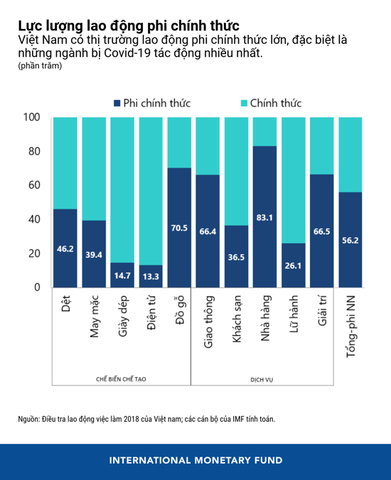 - Năm 2021, chính sách kinh tế vĩ mô cần tiếp tục duy trì định hướng hỗ trợ tăng trưởng để đảm bảo một sự phục hồi mạnh mẽ, bao trùm toàn diện. Trong quý 2 năm 2020, thị trường lao động của Việt Nam đã bị ảnh hưởng nặng nề, đặc biệt khu vực phi chính thức với quy mô khá lớn song mức độ tiếp cận bảo hiểm xã hội lại hạn chế. Mặc dù việc làm phi chính thức đã phục hồi trở lại sau đó nhưng những điểm yếu của thị trường lao động vẫn tồn tại. Các chính sách trong ngắn hạn nên tập trung vào duy trì bền vững việc làm, đồng thời thúc đẩy tái phân bổ nguồn lực trong nền kinh tế. Điều này có thể đạt được thông qua những biện pháp như trợ cấp tuyển dụng và các chính sách hỗ trợ chủ động cho thị trường lao động nhằm tạo cơ chế khuyến khích đào tạo nghề. Độ bao phủ của lưới an sinh xã hội hiện nay nên được mở rộng vĩnh viễn và hiệu quả của lưới cần được cải thiện. Qua thời gian, các chính sách nên hướng tới việc giảm tình trạng lao động phi chính thức thông qua cải thiện các kỹ năng lao động, giảm chi phí tuyển dụng/sa thải đối với lao động chính thức, cũng như khuyến khích việc chính thức hoá các cơ sở sản xuất kinh doanh phi chính thức.