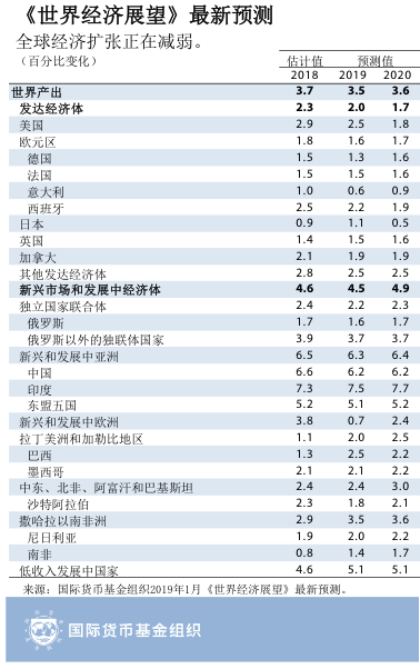尽管2018年全球增长仍然接近危机后的高峰水平,但全球经济扩张正在减弱,并且减弱的速度稍微快于预期。根据《世界经济展望》本期最新预测,全球经济2019年和2020年将分别增长3.5%和3.6%,比去年 10月预测分别低0.2和0.1个百分点。