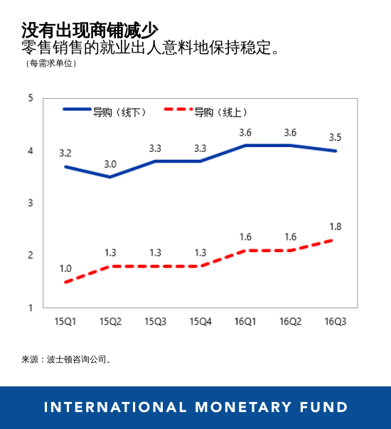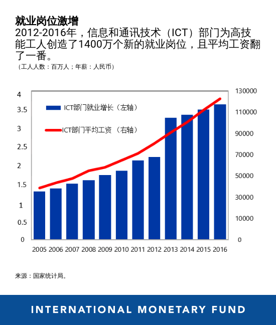但ICT部门的情况仅仅是中国就业图景的一部分。根据国际货币基金组织工作人员近期的工作文章,电子商务和共享经济是创造就业更有力的驱动因素。例如,阿里巴巴集团的电子商务平台拥有近1100万家中小企业,在十年间创造了3000万个就业岗位。滴滴出行科技有限公司的约车服务连接了1300万名司机。