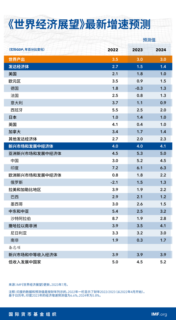 根据我们的基线预测,今、明两年全球经济增速将从去年的3.5%放缓至3%,较我们4月预测上调了0.2个百分点。全球通胀预计将从去年的8.7%下降至今年的6.8%(下调0.2个百分点),到2024年则将下降至5.2%。