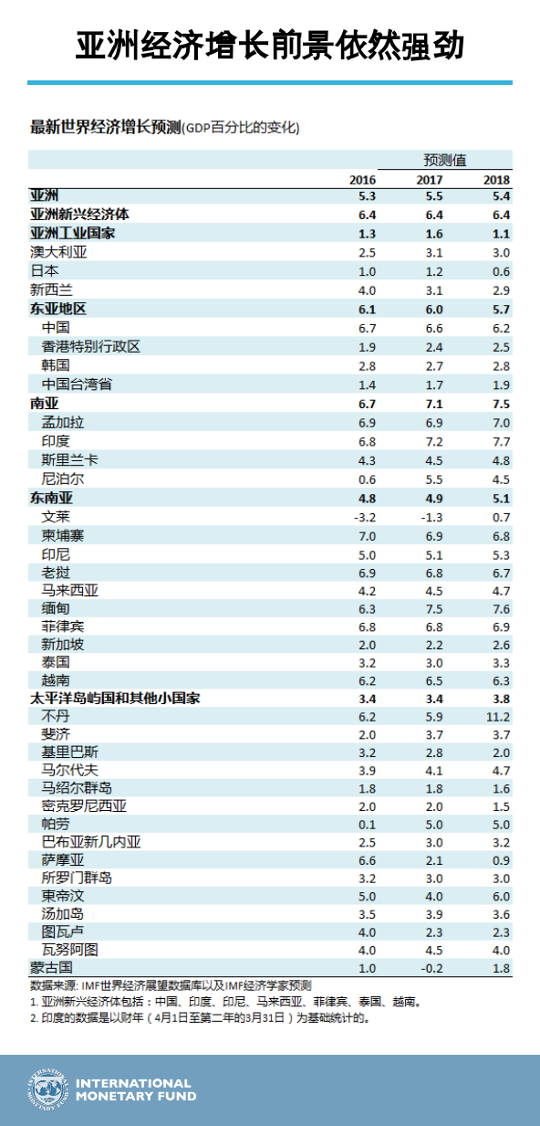 国际货币基金组织的最新地区评估指出,在普遍担忧保护主义抬头、社会迅速老龄化以及生产率增长缓慢的环境下,亚太地区仍继续保持强劲增长。