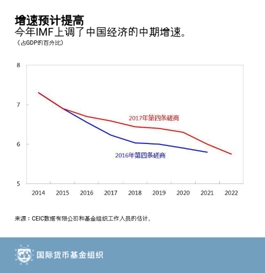IMF在最近对中国经济的年度评估中表示,中国经济继续强劲增长——2017年经济增速预计为6.7%,且有望在中期维持强劲增长;但若要安全地实现这一目标,则需要加快改革,减少增长对债务和投资的依赖性。.