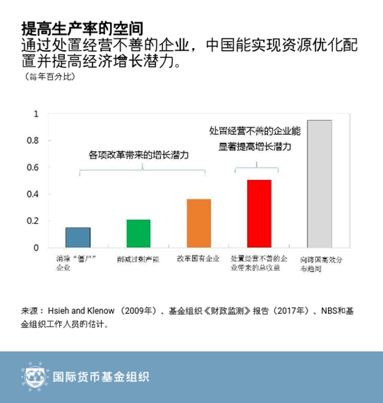 6. 中国也需要提高生产率。这可以通过更好地利用资源来实现,目前这些资源正流向亏损企业(“僵尸企业”)、产能过剩行业和国有企业。IMF估计,更好利用这些资源,将在长期使生产率对经济增长的贡献度提高约1个百分点。