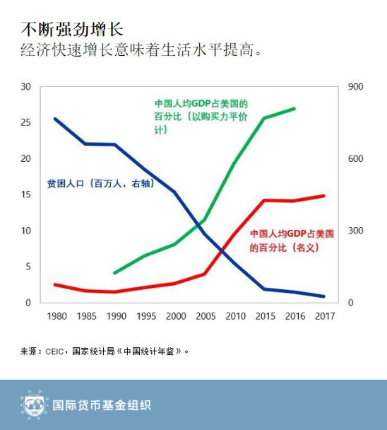 国际货币基金组织在对中国经济的最新年度评估中指出,中国经济继续呈现强劲态势,2018年增长率预计为6.6%。经过四十年的改革,中国从世界最贫穷国家之一转变成第二大经济体。